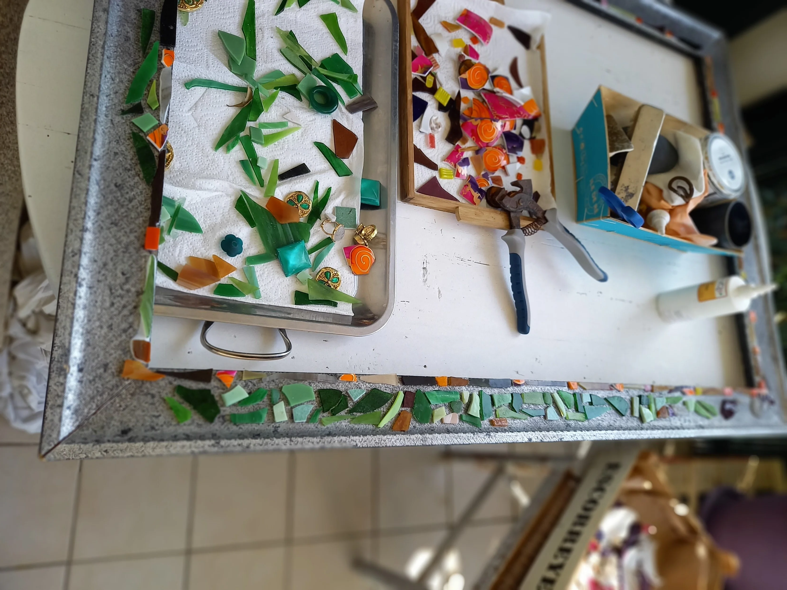 Matériel pour projet mosaïque avec des tesselles de verres, récup de bijoux, peinture sur porcelaine.